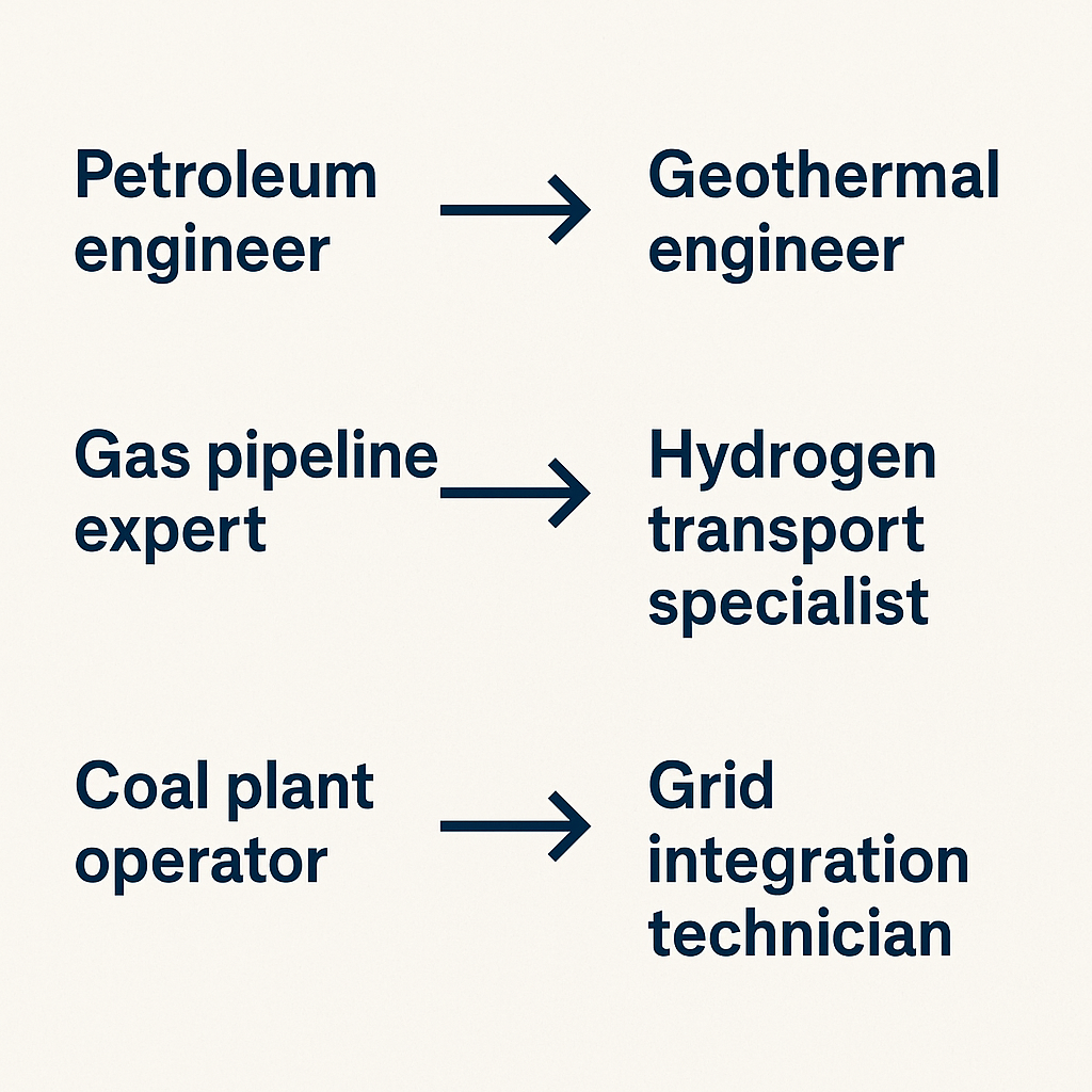 A geologist trained in oil exploration, for example, has valuable skills for identifying underground formations suitable for carbon storage. An electrical engineer who once designed grids for coal plants can apply that knowledge to integrating renewable systems. These are not complete departures, but reinventions of what already exists.